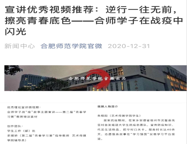 目前,该视频已作为我校优秀理论宣讲微视频推报省委宣传部,参加全省2020年度基层理论宣讲微视频评选。(学生工作部:葛畅 艺术传媒学院:史娌娇)