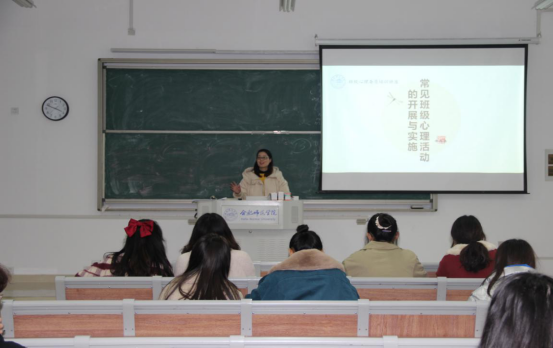 第三专题为“常见班级心理活动的开展与实施”,由心理健康教育中心李晶晶老师主讲。李晶晶以大量优秀班级心理活动为例,详细介绍了班级心理活动的作用、构成要素、流程、技巧和常用方法等内容,重点讲解了开展班级心理活动的技巧和方法。