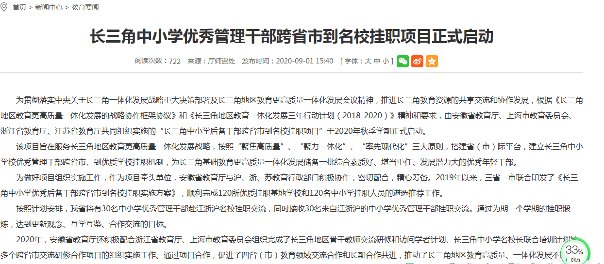 本网讯 2020年秋季学期,由安徽省教育厅牵头,皖、沪、苏、浙教育厅(教委)共同组织实施的长三角中小学后备干部跨省市到名校挂职项目正式启动,我院深度参与长三角地区教育更高质量一体化发展工作取得新进展。