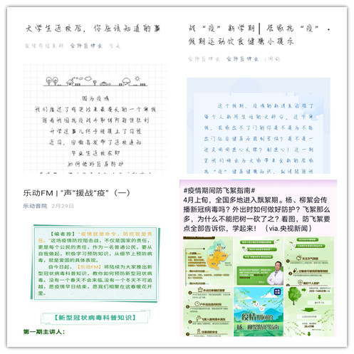 学院积极利用校园网页、微信公众平台和QQ群等网络媒体,及时推送专题疫情防控知识;学生工作处利用今日校园APP,开通“校园百事通”版块,设立疫情防控知识宣传专题,能够及时给予全体同学防控知识宣传和解答;学院各级学生组织发挥桥梁纽带作用,利用微信平台、短视频平台和QQ平台,积极转载发布各类疫情防控注意事项和权威知识。