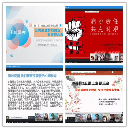 自疫情发生以来,学院高度重视疫情防控工作,及时发布《关于组织开展疫情防控期间线上主题班会活动的通知》,全体辅导员积极发挥作用,充分利用网络平台,多次召开线上主题班会,为同学们深入解读中央疫情防控精神,全面宣传疫情防控知识,严格强调疫情防控要求,确保全体学生能够了解疫情和做好防护。