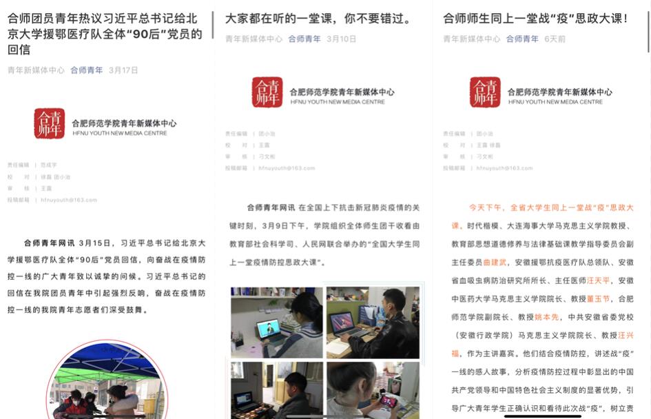 思想武装头脑,行动开创未来。根据疫情防控实际情况,学院结合习近平新时代中国特色社会主义思想“四进四信”活动,开展系列思想引领类活动。积极开展以防控新冠肺炎为主题的第八季“青年大学习”网上主题团课,学习宣传习近平总书记关于疫情防控工作的系列重要讲话和重要指示批示精神,解读相关决策部署,累计学习规模近13万人次,参学率超过85%。团员青年学习热议习近平总书记给北京大学援鄂医疗队全体“90后”党员的回信,同上全国和全省疫情防控思政大课,引导他们坚定理想信念,厚植爱国情怀,不断增强“四个意识”、坚定“四个自信”、做到两个“维护”。在线上组织开展第二期入团积极分子培训班,加强对入团积极分子的教育培养,增强团员意识和荣誉感。刘铭传学院举办“凝聚抗疫力量,弘扬雷锋精神”系列活动,通过新媒体平台积极组织开展疫情防控教育和爱国主义宣传教育。电子信息与电气工程学院开展“知行荟特训营活动”通过打卡的方式引导学生阅读红色书籍,营造全民阅读氛围。经济与管理学院通过“云”演讲的形式,分别从抗疫、小康、强国三个方面增进学生对社会主义核心价值观的认同。物理与材料工程学院辅导员通过网络在线召开学生干部会议,围绕疫情期间如何践行大学生的时代使命展开研讨。