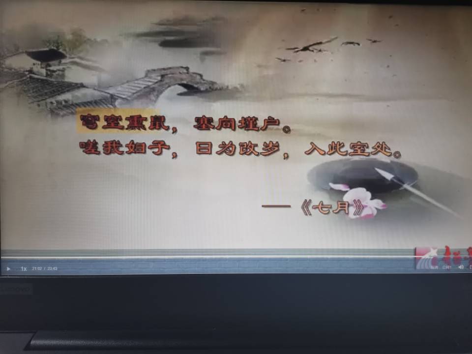 一首《七月》开启了学习《诗经》的序幕,这是一首以季节时间为主线来书写的古代诗歌,通过大量细节描写,描绘了古代男女农人的劳动生活,通过物候特征表现出节令的变化。老师采用“观看网课视频——了解文章大意”和“直播课堂——精细分析文句”相结合的方式,在与同学相互交谈中,准确传神地讲授文章的知识点,并及时提出一些小问题加深我们对于字词、语句的理解。