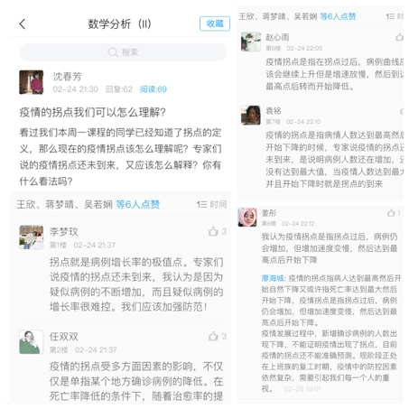 沈老师将函数的拐点与当下流行的“疫情拐点”名词相结合,调动学习积极性,让学生们进行充分的讨论,在关心国情的同时加强知识理解的深入度,深层剖析知识概念,将抗“疫” 题材有机融入函数的拐点课程之中,做到“把学到的知识运用于实践,又在实践中增长解决问题的新本领”。