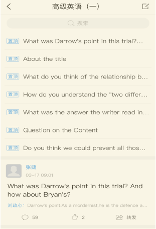 张老师每周提前发放讨论区的任务,让我们能够在预习的基础上结合讨论问题,更有目的性地理解文章的主旨。