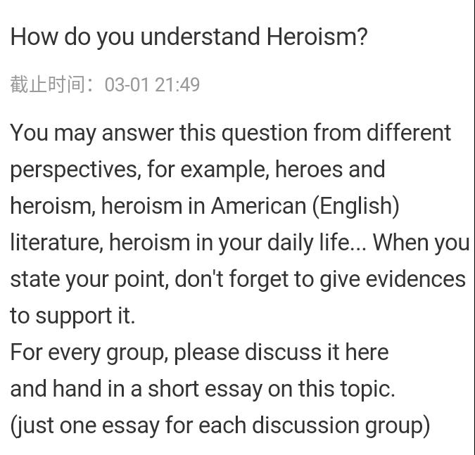 课后,老师让我们结合本节课所学知识,以小组形式书写一篇议论文,来发表我们自己对英雄气概的看法。