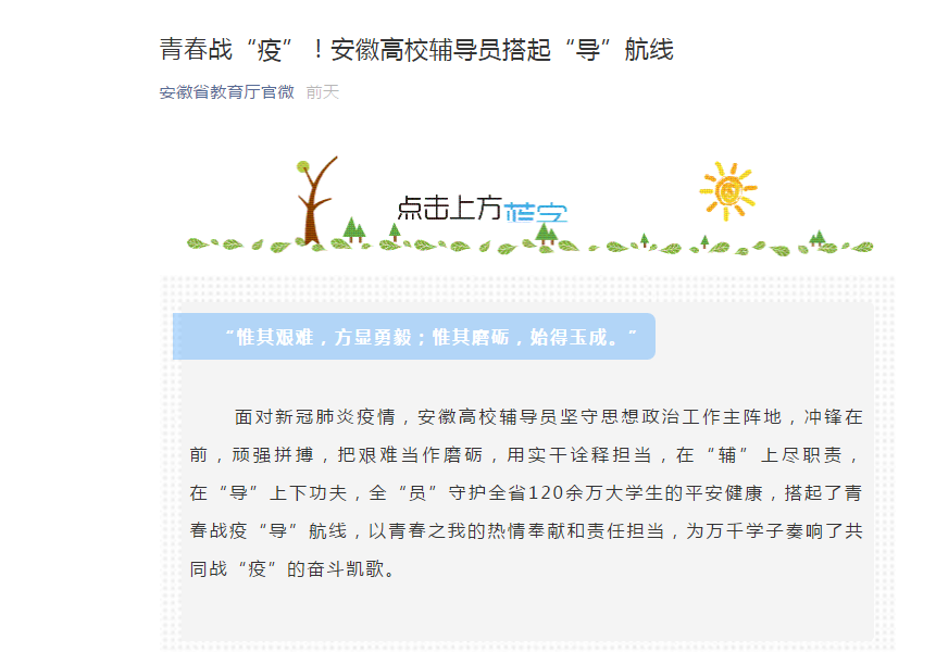本网讯 3月14日和3月13日,安徽省教育厅官微、新华网发文《青春战“疫”,安徽高校辅导员搭起“导”航线》,署名教思政,对安徽高校辅导员在疫情防控中的典型做法进行了专题报道。