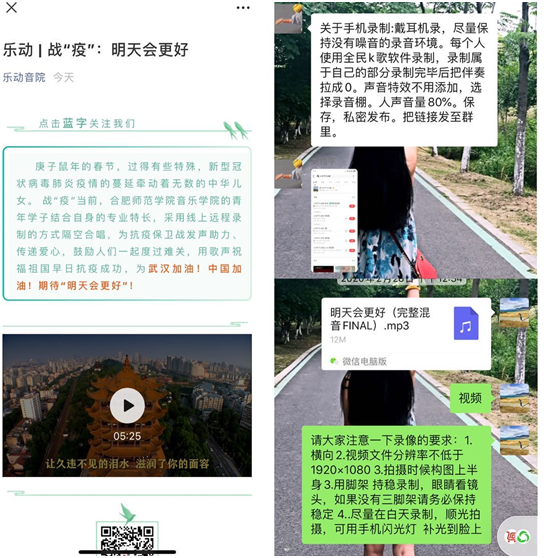 视频在音乐学院微信公众号“乐动音院”平台发布后,引起热烈反响,同学们纷纷转发。2016级音乐学二班学生章婷说,“能够参与到活动中,感到很荣幸!我们克服了诸多困难,遥远的地理距离,简陋的录音设备,可不管怎样,我们大家的心永远在一起的。我们院学生齐心协力,也让我切实的感受到了众志成城的力量,能够通过我们自己的方式给武汉加油,为祖国打气是非常有意义的!”(党委学工部 音乐学院)