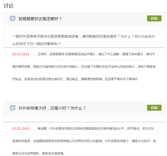 《国际贸易》课程的线上教学,是采用“直播+录播+MOOC慕课+学生自学”混合式教学模式来进行的,并采用了多元化手段来助力线上教学效果。学生每次开课前,我会将此次课程内容提前放在平台以便学生“预习”。开课时,会以平台“通知”的方式告知学生此堂课的学习任务,以便学生明确学习目标。同时,通过“学习通”签到打卡,以掌握学生的到课情况。开课中,会以直播点名提问、录播教学视频中随机设立讨论题要求学生在讨论区回答及小节测试等手段,来掌控学生的学习状态。课后,会以要求学生定期完成平台作业的形式,来及时了解学生知识掌握的薄弱点,以便下节课有针对性的加强学习。