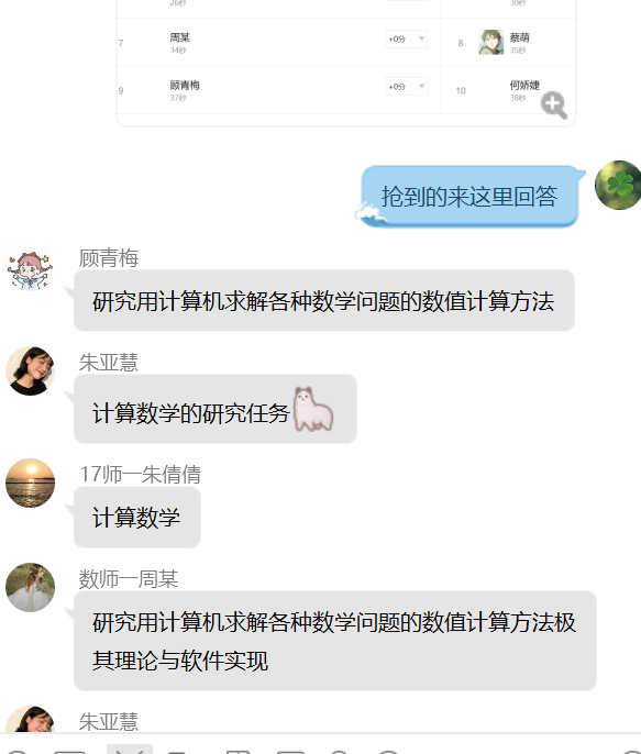 一是考虑平台功能,比如是否具有签到、抢答、分组、讨论等课堂互动功能。二是考虑平台对学生和教师的易上手程度。三是考虑课程库里可参考的课程资源。在充分了解众多平台后,我选择了超星泛雅课程教学平台。该平台不仅具有课堂互动所需要基本功能,操作简便,更重要的是大部分学生都有过使用“学习通”的经历。而且“学习通”的客服也会及时反馈咨询的问题。我教的《数值分析》是专业课,课程库里的资源不像基础课那么丰富,无论哪个课程库里都很难找到匹配特别好的课程,所以这方面影响不大 。为了让我们尽快熟悉平台的操作过程,我校在“学习通”上建立了班级,并安排了一些优秀的教师给我们做培训,比如钱莉娜老师就给我们上一堂精彩的线上直播课。她在课程的录制、课程互动环节的设置,学生成绩的设置等方面给我们做了详细的介绍,并针对线上课堂的师生互动,如问卷、分组讨论、签到、抢答等功能给我们做了现场的互动演示。听了钱老师的课,受益颇多,不仅让我掌握了学习通的使用方法,也坚定了上好网课的信心。