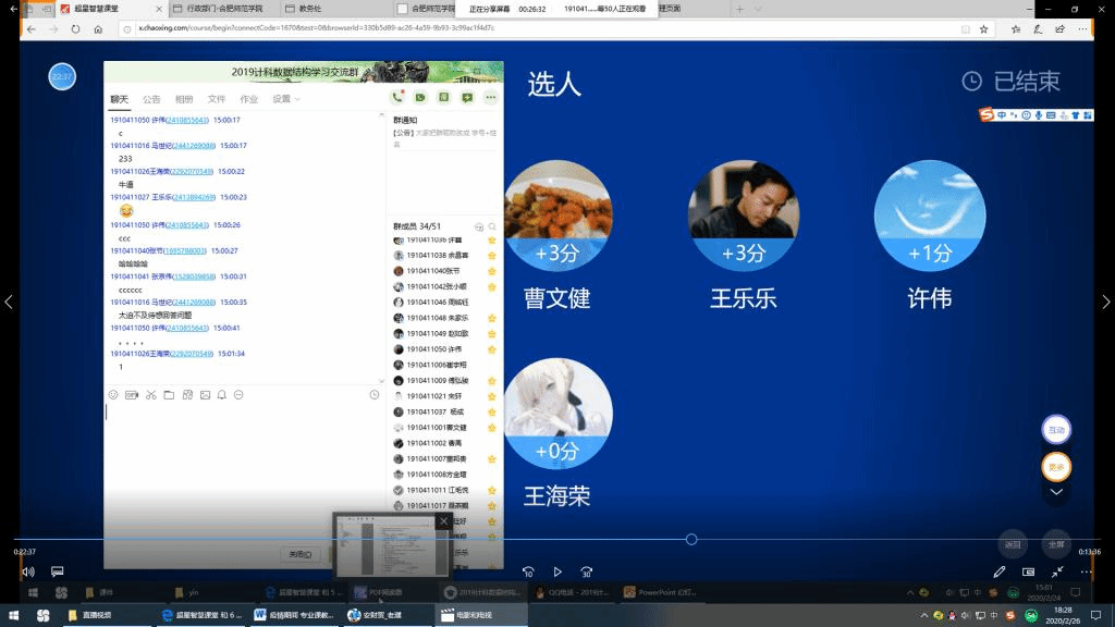 课中,我直播讲解教学重难点知识,针对学生课前讨论的情况进行答疑解惑。教师设计问题,通过“学习通”手机投屏方式进行选人/抢答,激发学生勤于思考、好学善问,同时也活跃了课堂、提高了学生学习的积极性。如果想掌握学生听课的状态,也可以使用QQ会议软件直播,师生可以彼此看到对方,随时掌握学生听课的状态,也激发了他们的兴趣。