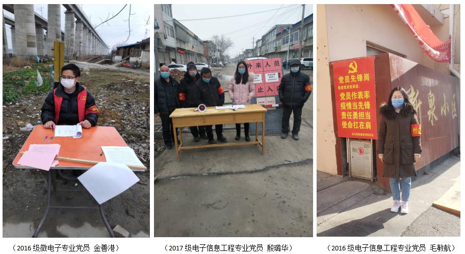 电子信息工程学生党支部动员全体党员,要有家国情怀,勇于担当,应该要自觉站在疫情防控第一线。2016级电子信息工程专业党员毛敏航、微电子专业党员金善港、2017级电子信息工程专业党员殷璐华发挥党员的先锋模范作用,主动参与乡村、社区人员的疫情排查走访、体温测量、宣传防疫知识等志愿服务工作。