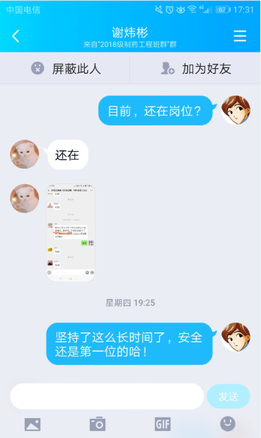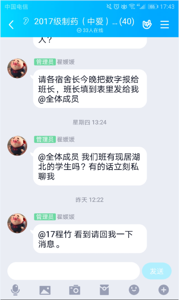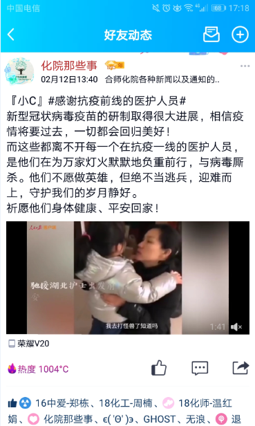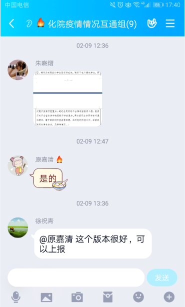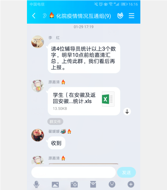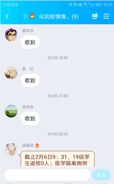 根据校党委的疫情防控部署,对标学校新型冠状病毒感染的肺炎疫情防控工作领导小组的指导精神,化学与化学工程学院第一时间将疫情防控命令传达给学院学工队伍全体成员。学院党委建立了“化院疫情情况互通组”QQ群,及时传达学校防控指令,互通教职工、各年级疫情防控实时信息。