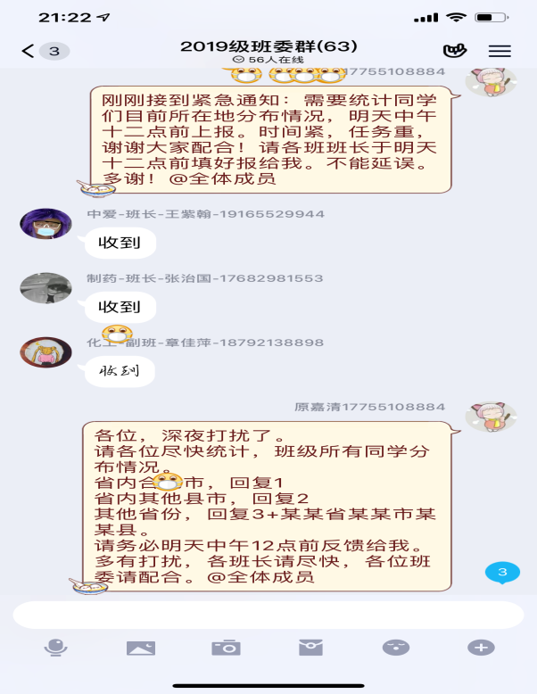各守岗位,落实工作。辅导员们在自己的岗位上各司其职,带领班级防控疫情骨干,对接好自己所带年级、班级学生,排查学生寒假期间外出轨迹,筛查过往疫区的情况。大家利用辅导猫、QQ群、电话等与学生们联系,特别是落实与身在省外学生联系的常态化,征询学生生活状况、防控状态等。