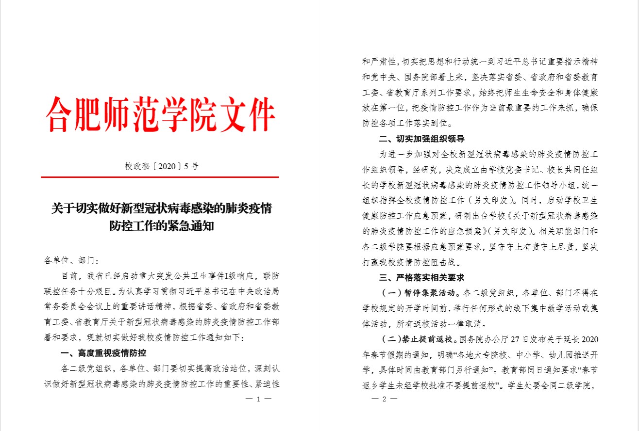提高政治站位,强化思想共识。校党委第一时间组织专题学习传达习近平总书记在中央政治局常务委员会会议上的重要讲话、安徽省疫情防控工作电视电话会议以及省委教育工委省教育厅有关文件精神,明确要求全校各级党组织和广大党员干部深刻认识做好防控工作的极端重要性和现实紧迫性,树牢“人民利益高于一切”、“师生生命安全和身体健康是第一位”和“疫情就是命令,防控就是责任”的思想,从增强“四个意识”、坚定“四个自信”、做到“两个维护”的政治高度,不忘初心、牢记使命,以上率下、担当作为,切实把疫情防控工作作为当前最重要的工作来抓,团结带动师生员工把思想和行动统一到习近平总书记重要讲话精神和党中央重大决策部署上来,统一到安徽省有关会议文件精神要求上来。