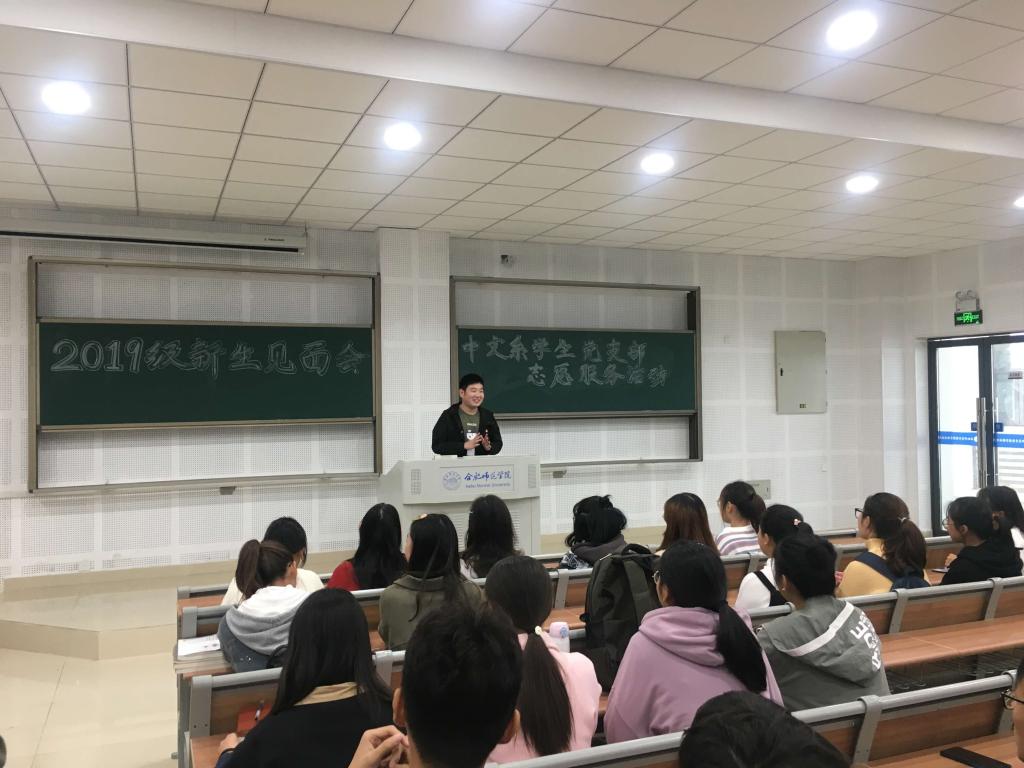 11月5日,在文学院党总支书记李旺生指导安排下,中文系学生党支部来到滨湖校区,召开了既浓重热烈又轻松活泼的新老生见面会。他们给这次见面会取了一个很有诗意的名字,叫“相遇”。2017级师范班的史义鑫、李晨同学分别从自己的大学生活、学习和成长经历出发,激励学弟学妹们要把学习摆在首位,积极参加各种学生社团活动,服务奉献他人,多参加各类比赛,尽情展示才能。老生新生的“相遇”,老生党员激励新同学要践行“爱满天下,知行合一”的校训精神,经过四年的拼搏奋斗,一定可以遇见最好的自己!新生同学通过解疑释惑,增强了集体归属感和身份认同感,更加明确了自身肩负的使命与责任。