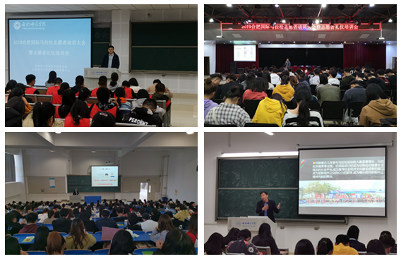 赛事志愿服务的准备阶段先后召开第一次志愿服务联席会,部署招募志愿者的相关事宜和具体安排;志愿者招募工作结束后,召开分组会议,将志愿者分为赛前物资发放、医疗服务等十二个大组类别,同时分别设立大组长和组内小组长,确保实现分工科学、任务明确、有效管理、指令直达;在锦绣校区和滨湖校区同步举行的志愿者培训会上,合肥国际马拉松组委会邀请合肥市卫健委的领导与合肥市体育局的专业老师到会指导,讲解马拉松精神、历年合马经验、志愿者要求以及医疗急救知识和实操训练,力求快速实现合马服务专业化。志愿者动员大会暨志愿礼仪培训会上,对志愿服务工作作最后确认,并就可能发生的意外事件作应急预案部署。为保障比赛当天志愿服务有序开展,全体志愿者参加了赛前联调演练。一切对照比赛当日进程进行演练,全面熟悉赛场与岗位,立志为合马比赛提供一流服务。