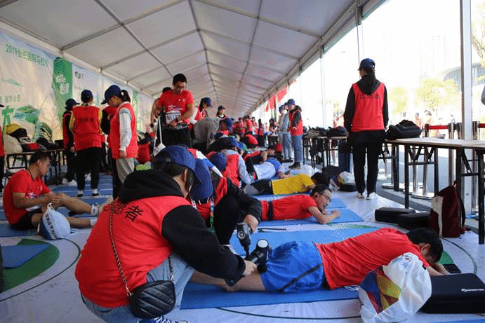 志愿者们在赛后拉伸区为参赛者做赛后恢复