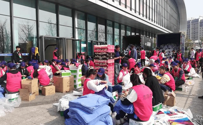 正在打包赛前物品包的志愿者们