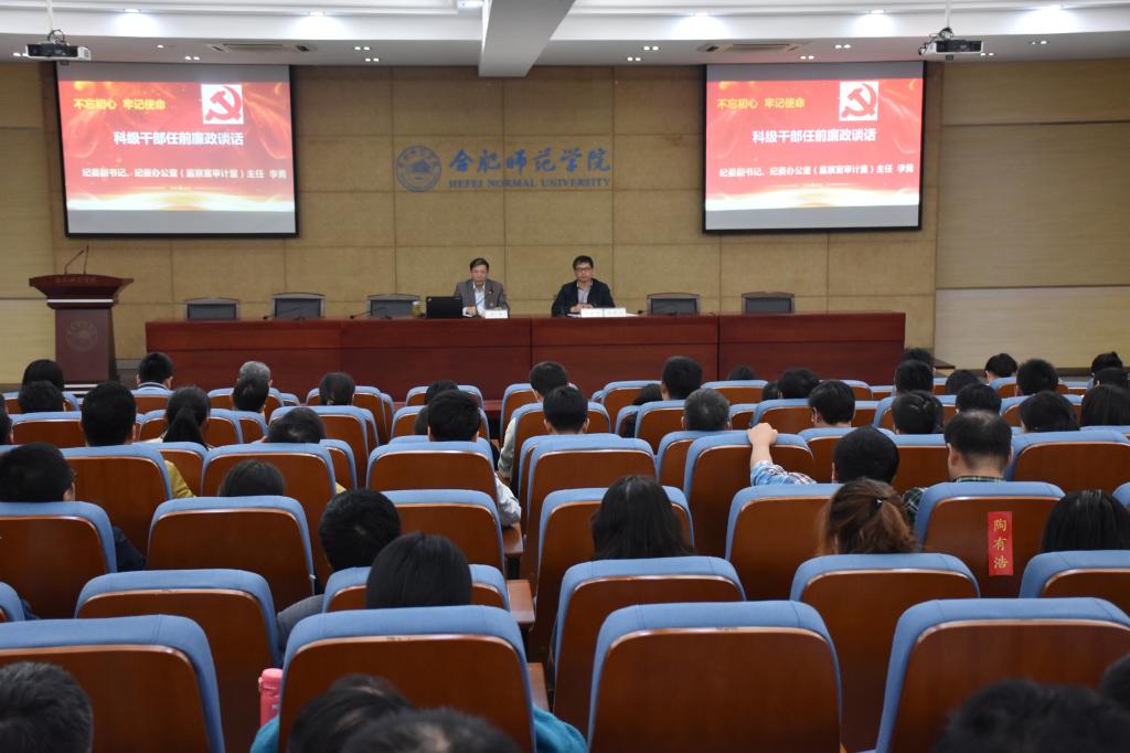本网讯 近日,学院主题教育科级干部培训班举行专题报告暨新任干部集体廉政谈话会,院党委委员、组织部部长华银峰,院纪委副书记、监察审计室主任、纪委办公室主任李勇,全体新任科级干部参加谈话会。