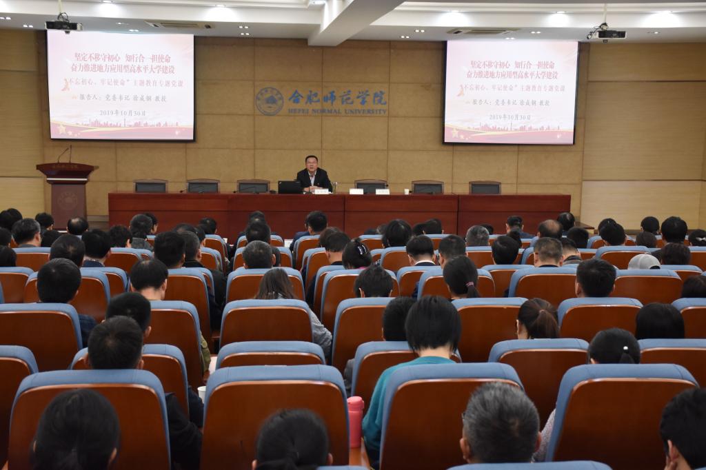 本网讯 10月30日下午,学院举行“不忘初心、牢记使命”主题教育专题党课报告会,院党委书记徐成钢教授作题为《坚定不移守初心,知行合一担使命,奋力推进地方应用型高水平大学建设》专题党课报告。省主题教育第十六巡回指导组联络员、省委组织部公务员考录培训处副处长薛惠明,巡回指导组成员、安徽皖通高速公路股份有限公司团委书记、党务管理部主管胡兴洪到会指导。党委副书记、院长孙道胜主持报告会。