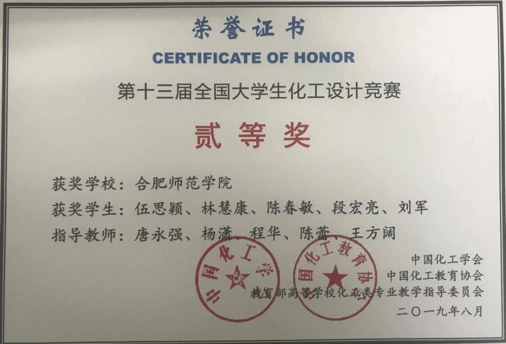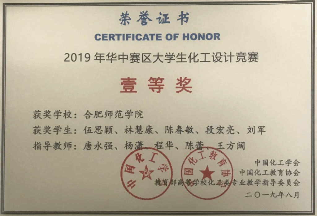 本网讯 近日,第十三届全国大学生化工设计竞赛华中赛区决赛在江西理工大学举行。我院化学与化学工程学院伍思颖、林慧康、陈春敏、段宏亮、刘军等5名同学组成的“今烯何烯”代表队在决赛中沉着冷静、发挥出色,得到了专业评委的一致认可,荣获赛区一等奖,同时获得全国二等奖。