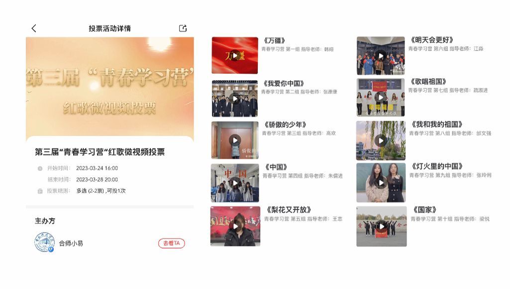 本次活动通过“易班•今日校园”平台开展,第三届“青春学习营”全体学员参加此次活动,各小组指导老师认真指导,对参赛作品进行严格审核把关,确保参赛作品高质量产出。《国家》、《我和我的祖国》、《我爱你中国》等一首首耳熟能详的歌曲,唱响了时代主旋律,展现了我校学生蓬勃向上的新时代精神风貌。经网络投票及综合评定,评选出一等奖2名、二等奖3名、三等奖5名。