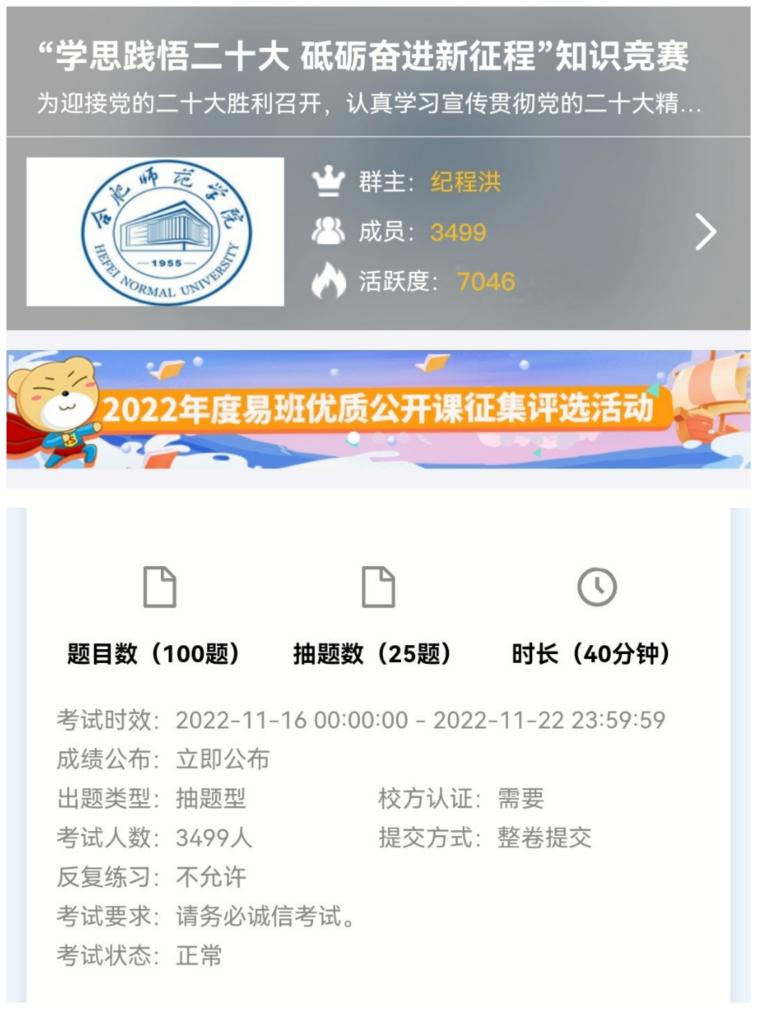本次竞赛活动通过“易班·今日校园”平台线上开展,竞赛内容为党的二十大报告内容与党的基本知识,题库共100题,采用随机抽题的形式作答。竞赛期间,各二级学院积极动员宣传,学生热情参与,共有3499名同学参加竞赛。