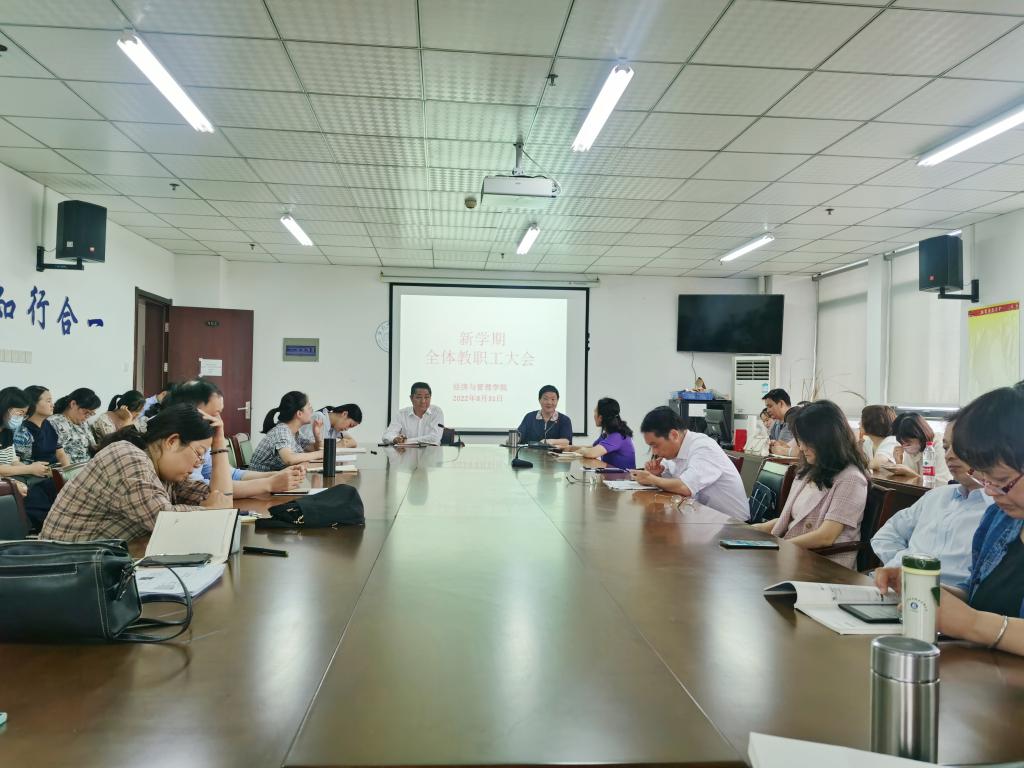 本网讯 8月31日,经济与管理学院召开新学期第一次全体教职工大会,传达学习有关会议、文件精神,安排部署学期初和本学期重点工作。