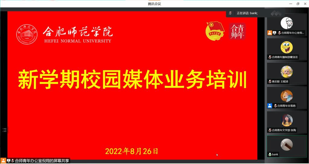 本网讯 为提升我院校园媒体学生干部业务能力,发挥学院共青团宣传工作积极效果,8月26日下午,院团委依托腾讯会议开展新学期校园媒体业务培训。院团委宣传思想部负责人王露,院团委全体校园媒体学生干部100余人参加培训。培训由合师青年传媒中心主任宋雪艳主持。