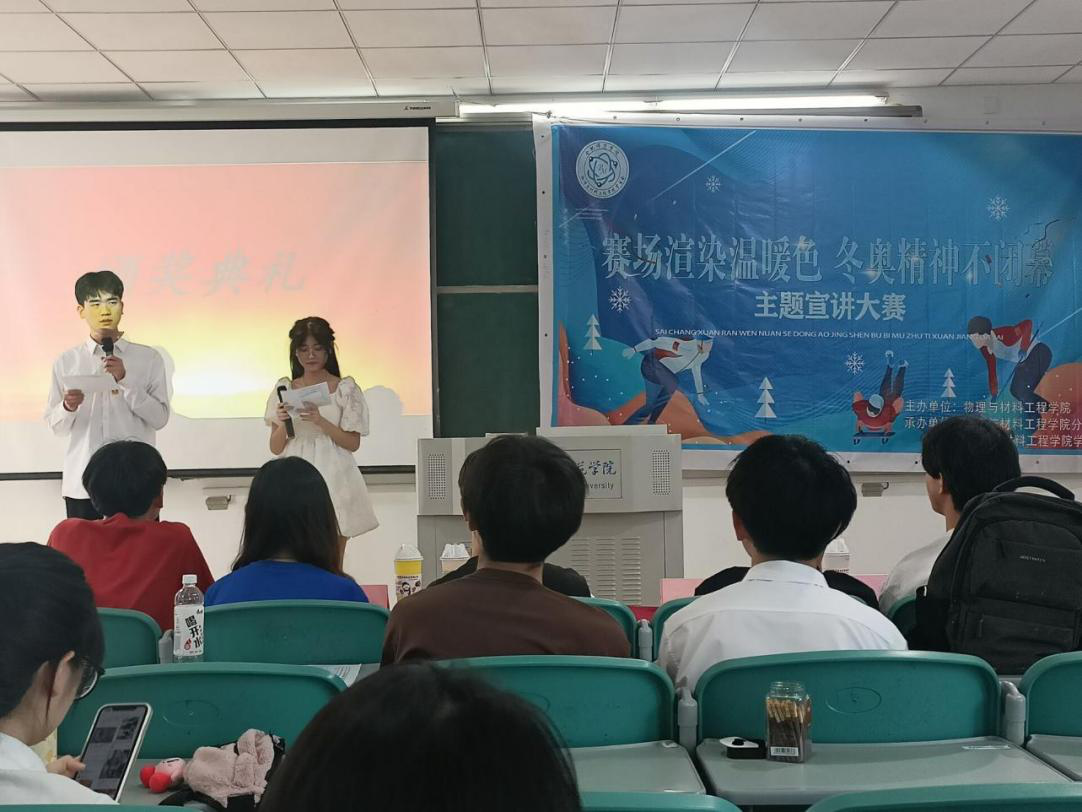 本网讯 为弘扬“胸怀大局、自信开放、迎难而上、追求卓越、共创未来”的冬奥精神,展现合师学子昂扬奋发的精神风貌,5月22日,由物理与材料工程学院分团委承办的“赛场渲染温暖色,冬奥精神不闭幕”大赛决赛在滨湖校区成功举办。
