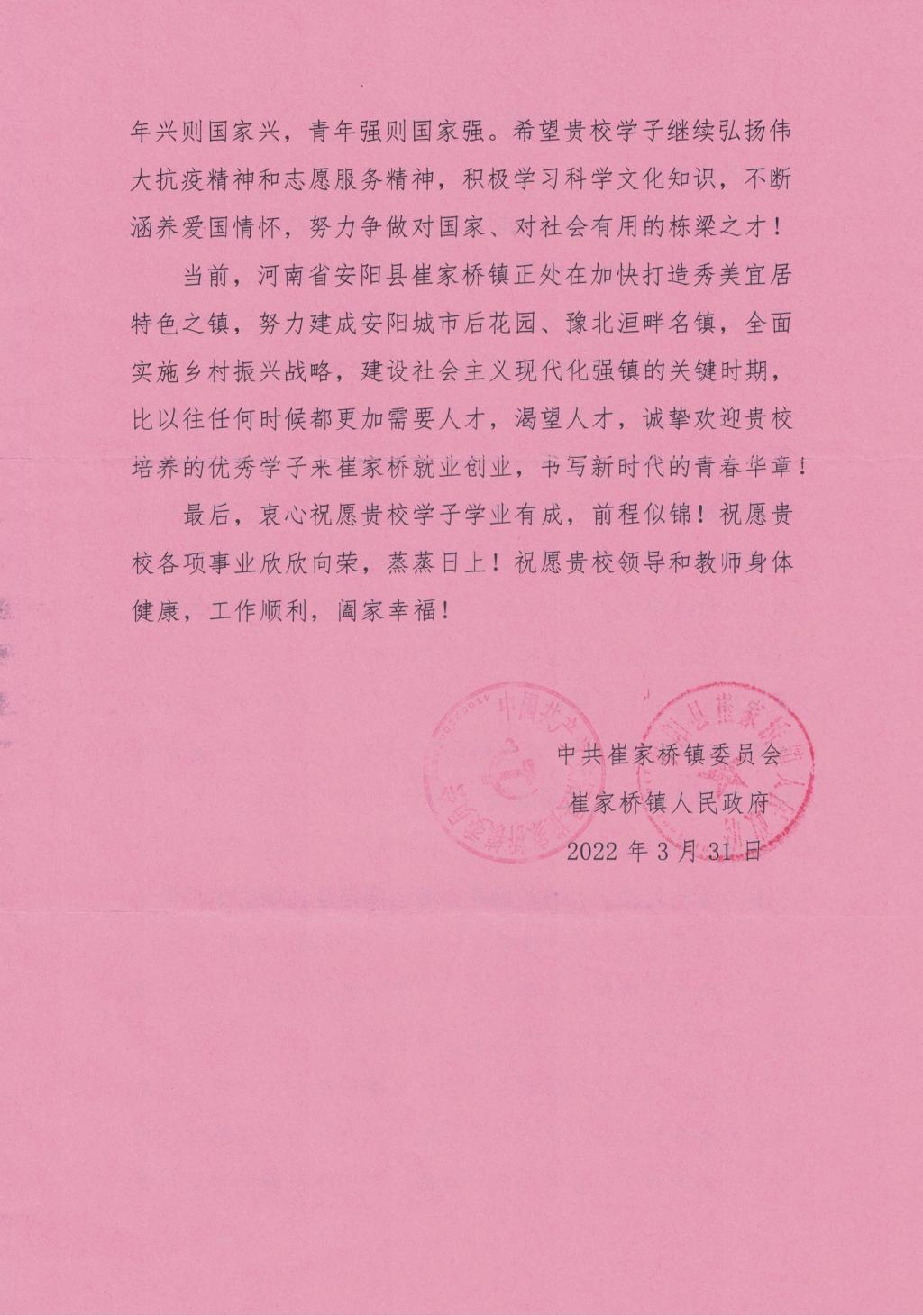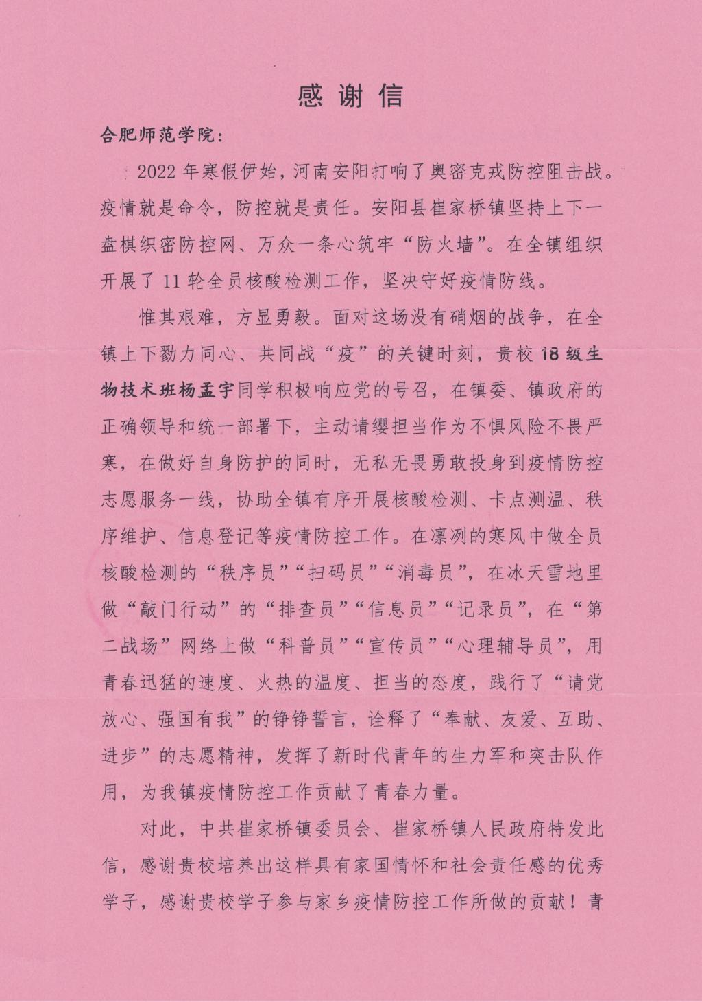 本网讯 近日,beat365唯一官方网站生命科学学院收到了来自河南省安阳县崔家桥镇的感谢信。信中对18级生物技术班杨孟宇同学不畏艰险、奋勇向前,积极投身家乡的疫情防控志愿服务表达了诚挚的感谢和崇高的敬意。
