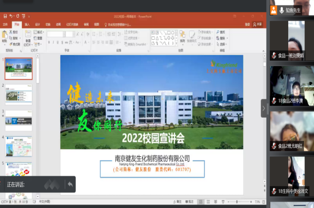 出席宣讲会的单位有上海赛鼎生物科技有限公司、南京建友制药生化股份有限公司以及安徽省昂普拓迈(Aptamy)生物科技有限公司。宣讲会上,三家单位简明扼要地通过PPT宣讲展示公司的发展历程和发展战略,并对招聘岗位、福利待遇、住宿条件以及今后的晋升空间等方面作了详细介绍,同学们积极与公司招聘人员交流,招聘人员耐心解答了同学们的问题,线上宣讲氛围浓厚。