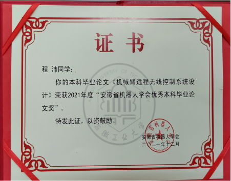 会议现场举行了2021年度安徽省机器人学会优秀本科毕业论文奖的颁奖仪式,电子信息与电气工程学院2021届毕业生程沛同学本科毕业论文《机械臂远程无线控制系统设计》获评安徽省机器人学会年度优秀本科毕业论文。