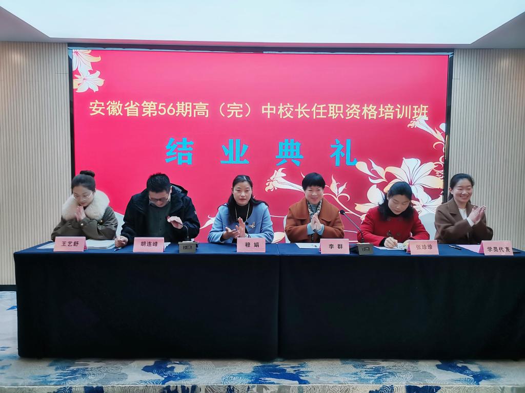 胡连峰、张珍珍分别回顾了培训从开班到结业的过程,对学员的表现给予高度的赞扬与肯定,对学院负责人对此次工作的大力支持表示感激,并对此次培训班全体学员顺利毕业表示衷心的祝贺。王艺舒向大家谈了这份工作的收获,并表以感激。来自淮南二中的杨洁校长作为学员代表作了发言,他代表全体学员对学院的各项工作表示感激,分享了此次培训过程的所学所得,对即将分别的同学表示了不舍与感激,最后希望各位学员再接再励,不负众望,加强交流,共同进步,为推进安徽省的基础教育事业发展奉献力量。