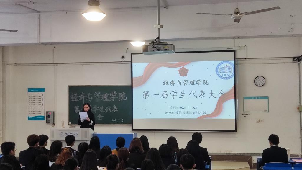 本网讯 11月3日,经济与管理学院第一次学生代表大会在锦绣校区逸夫楼109教室组织召开。经济与管理学院党委副书记陶敏老师应邀出席,分团委书记赵燕、学院各年级团干、普通学生共九十名齐聚一堂,共同谋划全院学生自身发展的大事。