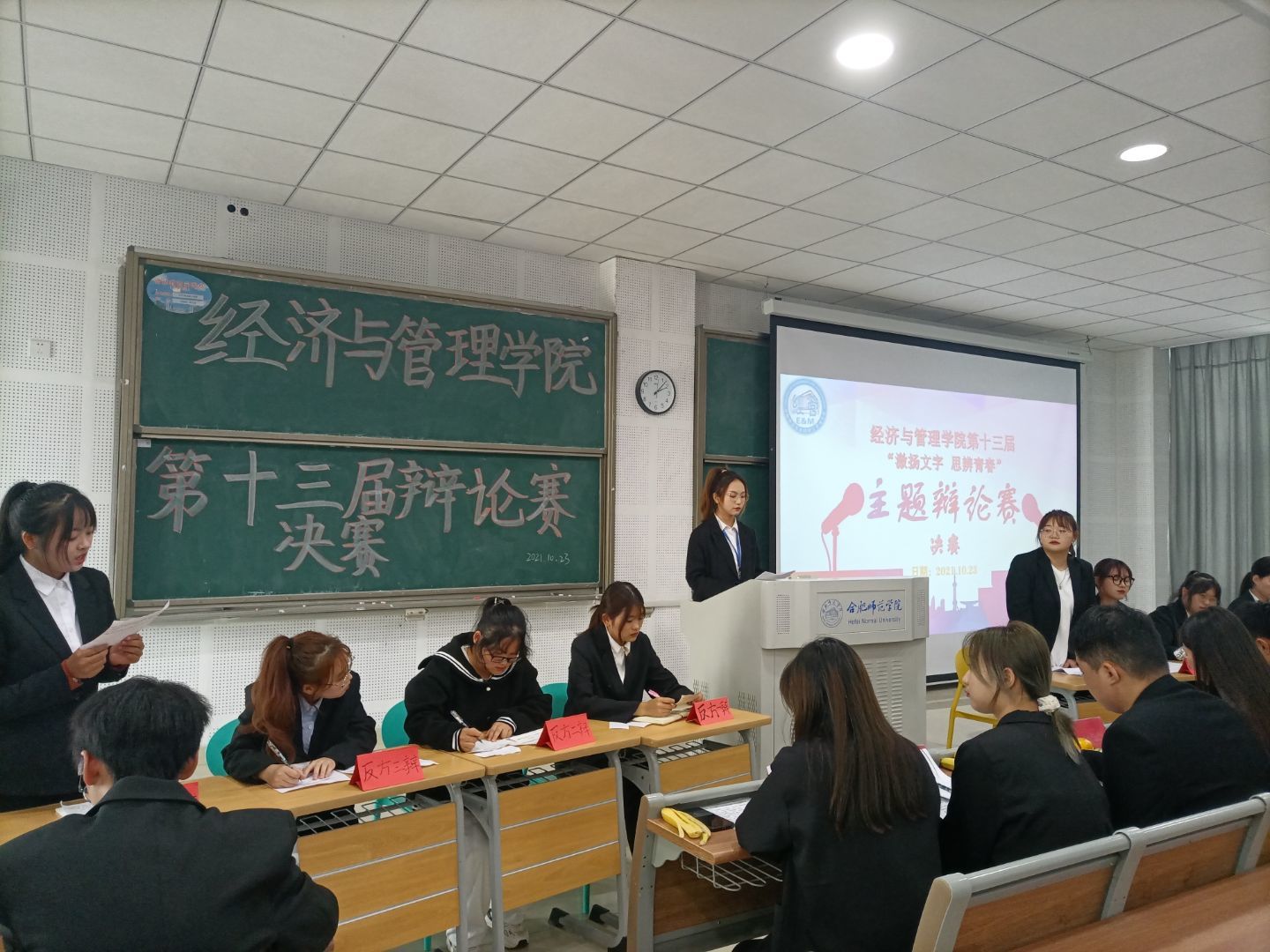 本网讯 以论明理、以辩会友。10月23日下午,经济与管理学院主办的第十三届主题辩论赛决赛于在滨湖校区博学楼D101顺利举行。此次辩论赛邀请学院学生会主席团以及我校辩论队的优秀队员担任本次大赛评委,各专业班级代表参加此次活动。