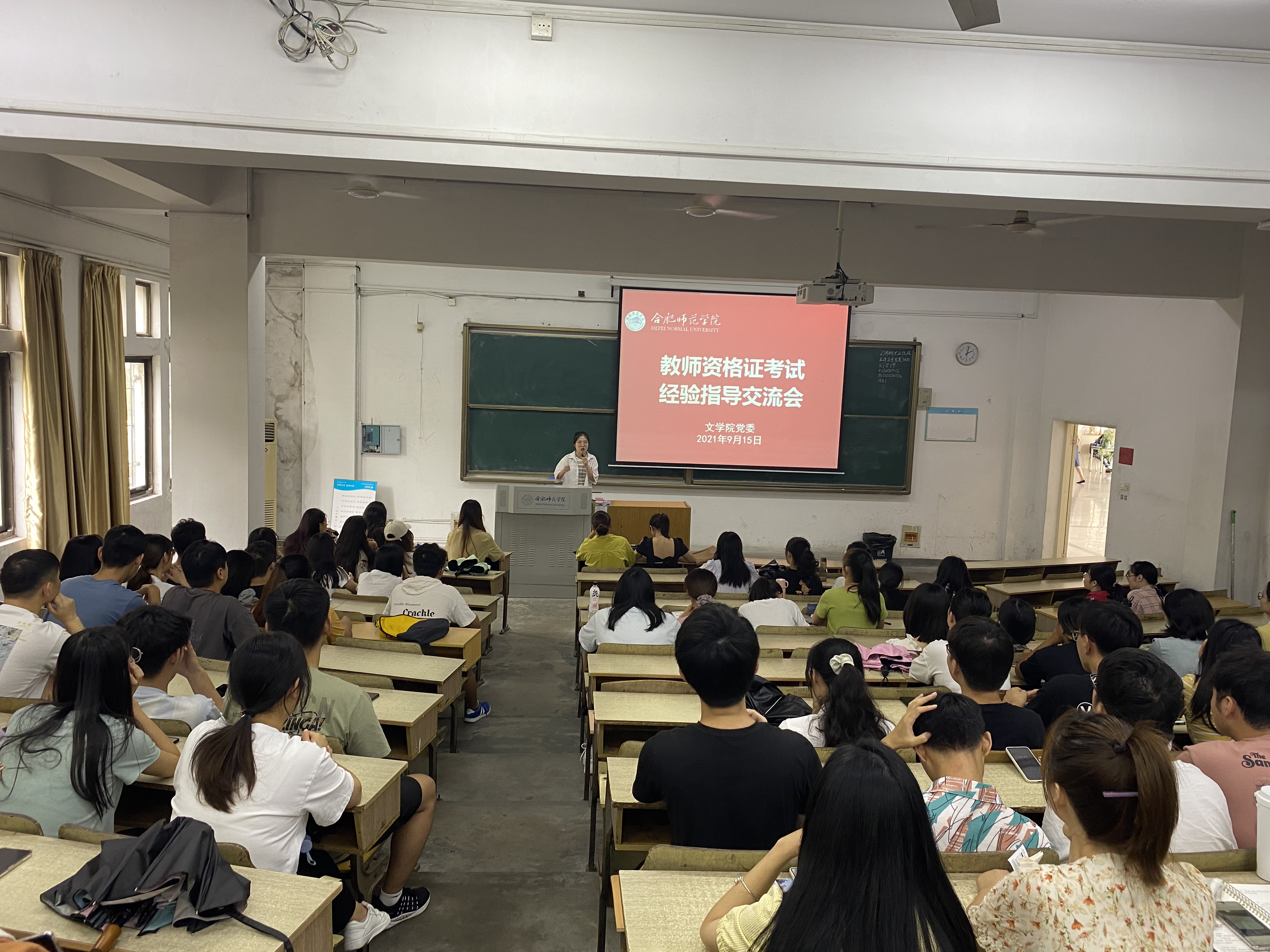 本网讯 为进一步提升师范生专业技能,帮助教师资格证考试备考学生积累经验,明确目标和方向,提高教师资格考试通过率,9月15日下午,文学院在锦绣校区博约楼举办教师资格证考试经验交流会,交流会邀请2018级通过教师资格考试的五位学生党员进行现场指导讲解,2019级、2020级学生参会。