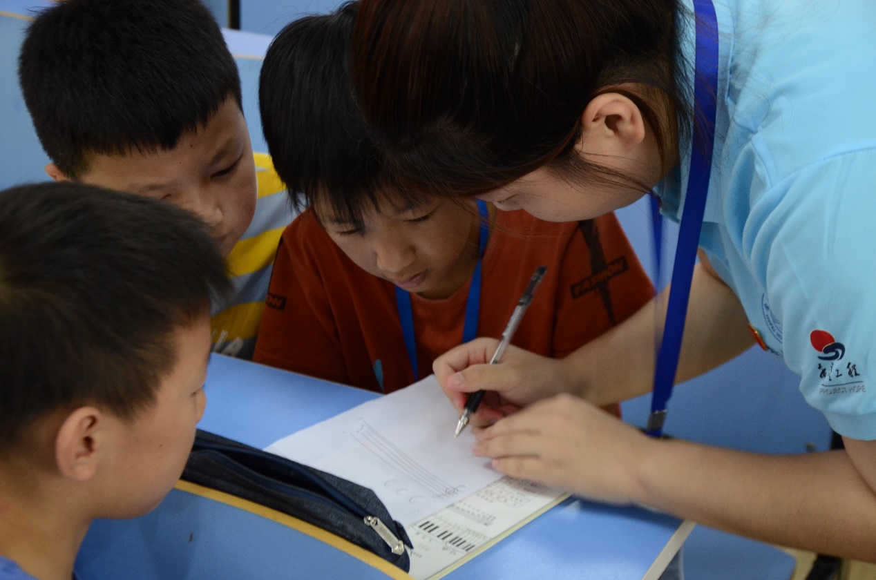 小学员们聚精会神的听着“小先生”的讲解,时不时地与同桌的小学员讨论着。