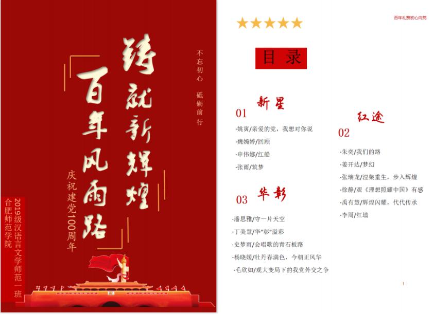 本网讯 为庆祝中国共产党成立100周年,时刻牢记“感党恩、听党话、跟党走”,发挥专业特长,展示大学生党史学习教育学习成果,文学院2019级汉语言文学(师范)专业编写出版党史学习教育专题班刊。
