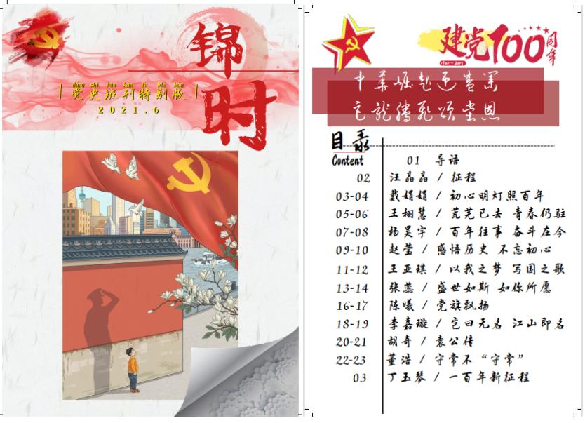 紧扣“用心学史、用情领悟、用笔记录、用力落实”的编纂初衷,文学院党委高度重视,2019级汉语言文学(师范)1班、2班班刊编委会在辅导员郝嘉乐老师的指导下,经过选题、组稿、审稿、编校、封面设计、出版等一系列环节,历时两月有余,完成党史学习教育专题班刊。自征稿以来,班级同学积极响应,成刊共收录作品27篇,内容包含党史学习教育感悟、树立理想信念、自强立志成才、革命书籍影片观感等丰富内容。