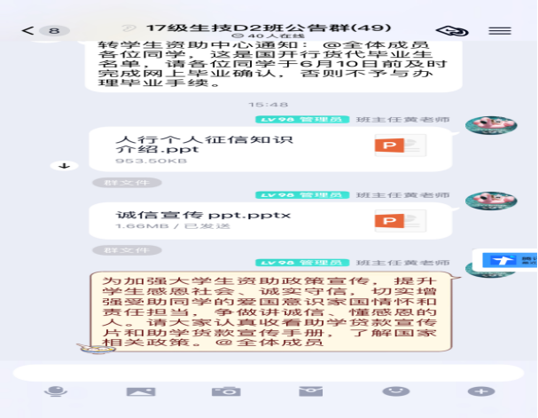 观看影片及发放宣传手册。将助学贷款宣传片、宣传手册ppt线上发放给学生,让学生更加熟悉贷款流程。通过《人行个人征信知识介绍》、《2020年诚信宣传》PPT等宣讲材料,向学生宣讲诚信和金融知识,普及征信及信用知识,以案例的形式向学生解读诚信感恩的重要性,进一步增强学生诚信意识。