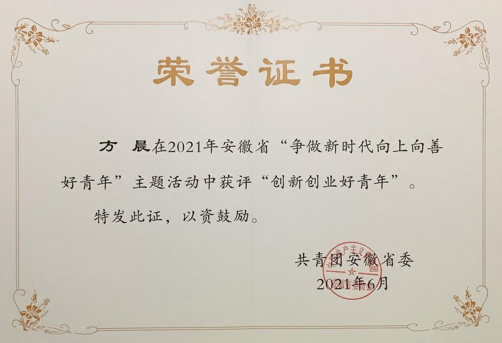本网讯 日前,共青团安徽省委员会公布2021年安徽省“争做新时代向上向善好青年” 推选活动结果,学院2018级电子信息工程专业学生方晨同学获评“创新创业好青年”荣誉称号。这是学校学子首次获此殊荣。