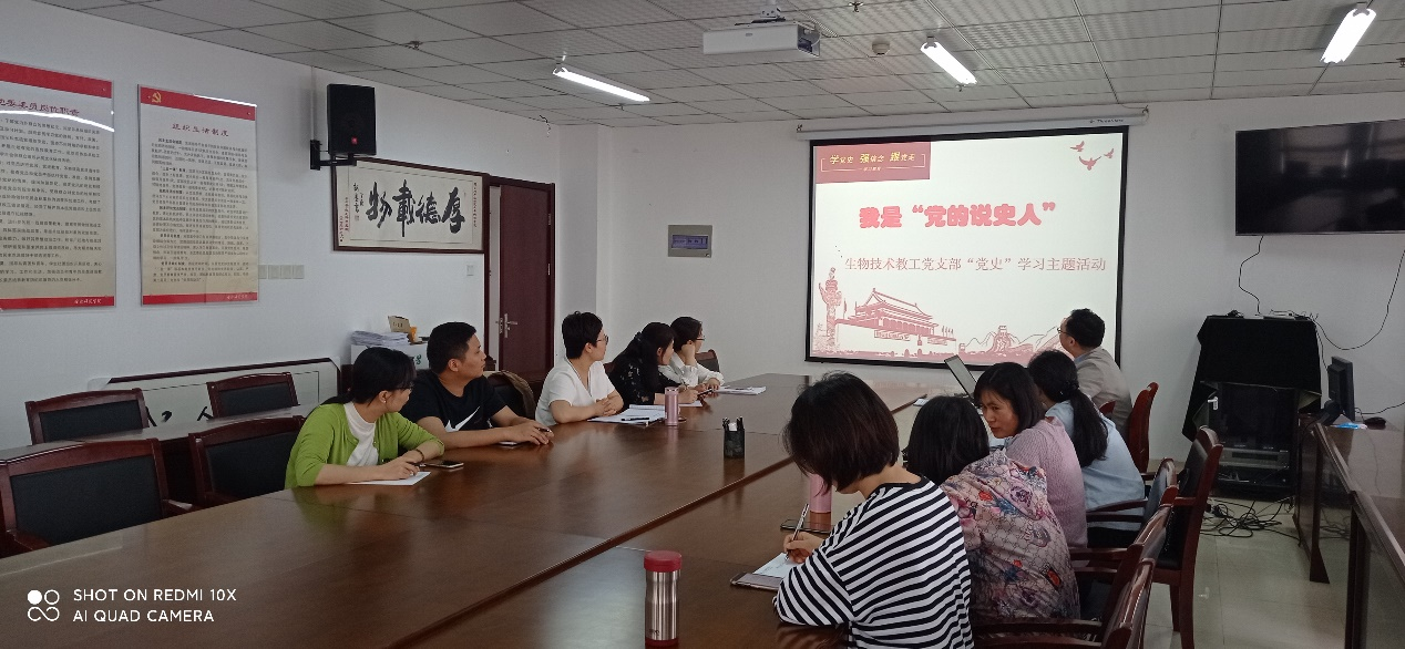 本网讯 铭记百年党史,砥砺奋进前行。5月12日,为深入贯彻落实习近平总书记重要讲话精神和学校党委关于“党史”学习教育部署的相关要求,响应生命科学学院党委“十个一”主题活动,生物技术教工党支部组织开展学“党史”——“我是党的说史人”活动。活动由生命科学学院生物技术教工党支部书记陈金武主持。