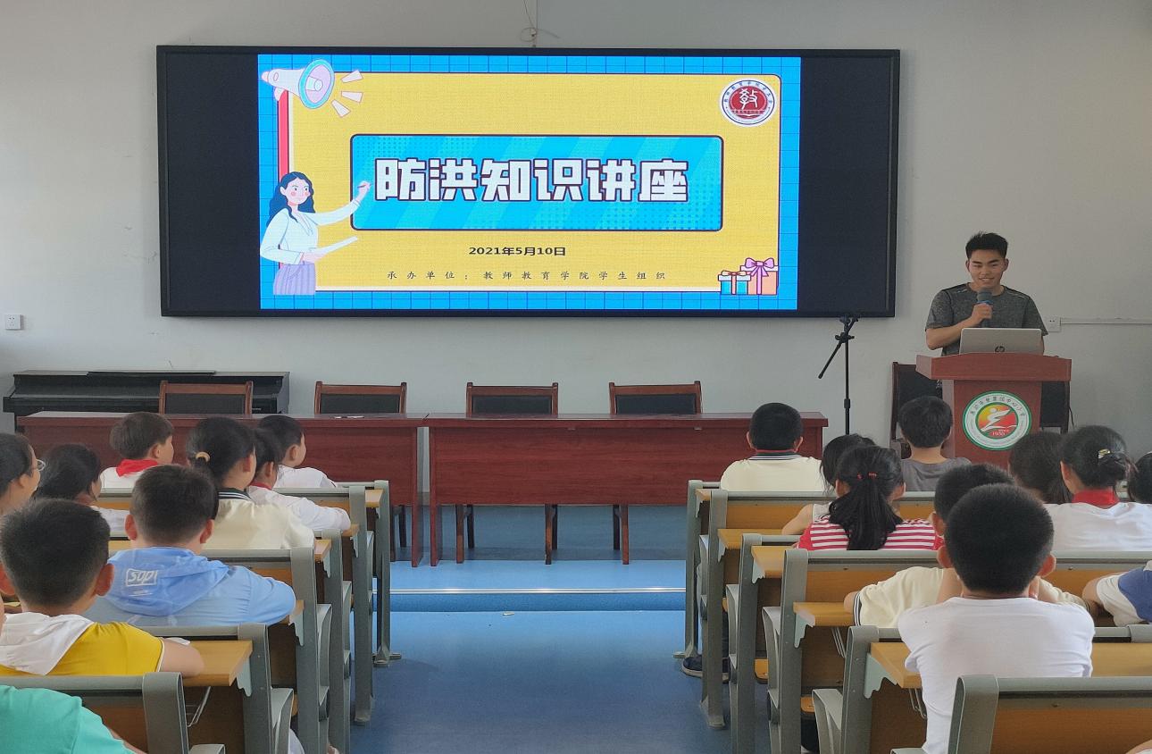 本网讯 为进一步落实习近平总书记在党史学习教育动员大会中“学史明理、学史增信、学史崇德、学史力行”的要求,教师教育学院深入开展“学党史、强信念、跟党走”学习教育。5月10日下午,教师教育学院分团委、学生第一党支部应黄麓镇中心小学的邀请,组织党员、团员青年前往该校为全体四年级学生开展防洪防汛安全知识宣讲,2019级应用心理学专业唐旭州同学担任主讲。