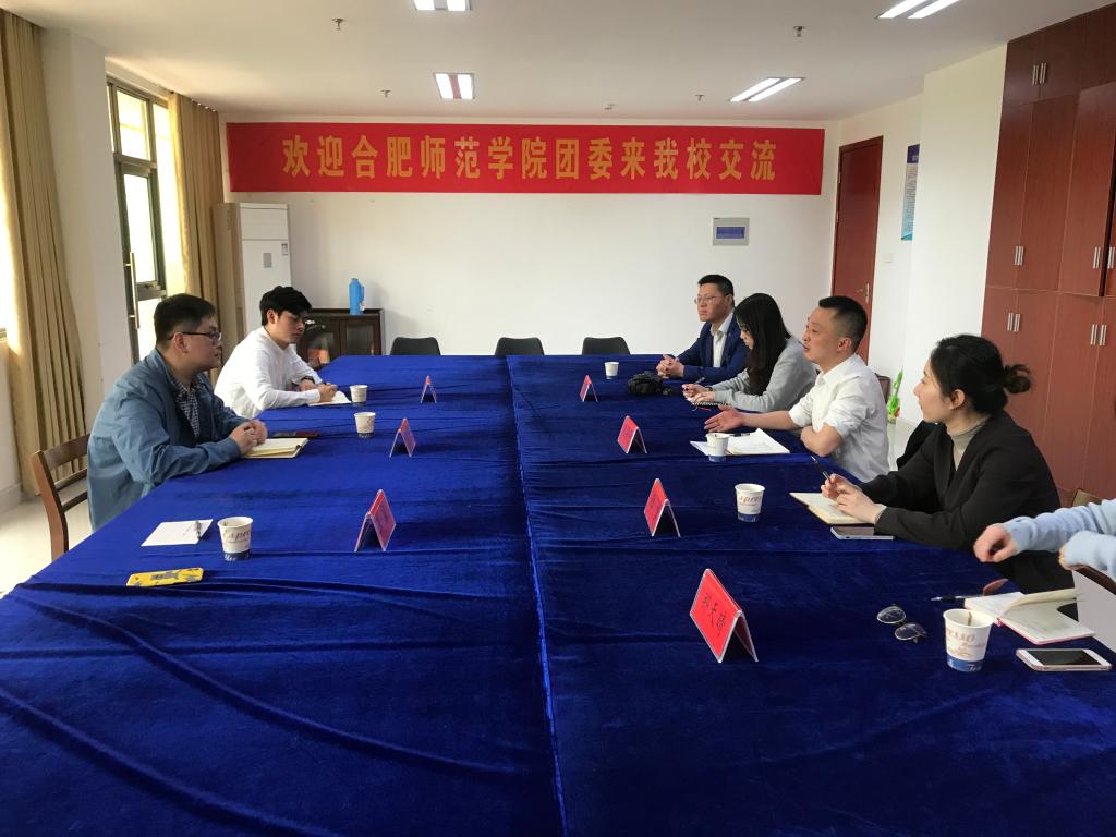 在铜陵学院团委,张平平向我院团委一行到来表示热烈欢迎,并介绍了铜陵学院共青团工作基本情况。刁文彬对铜陵学院的热情接待表示感谢,并介绍了我校共青团工作基本情况。双方就学生社团建设管理、“第二课堂”成绩单制度落实、大学生活动中心管理等方面进行了交流。