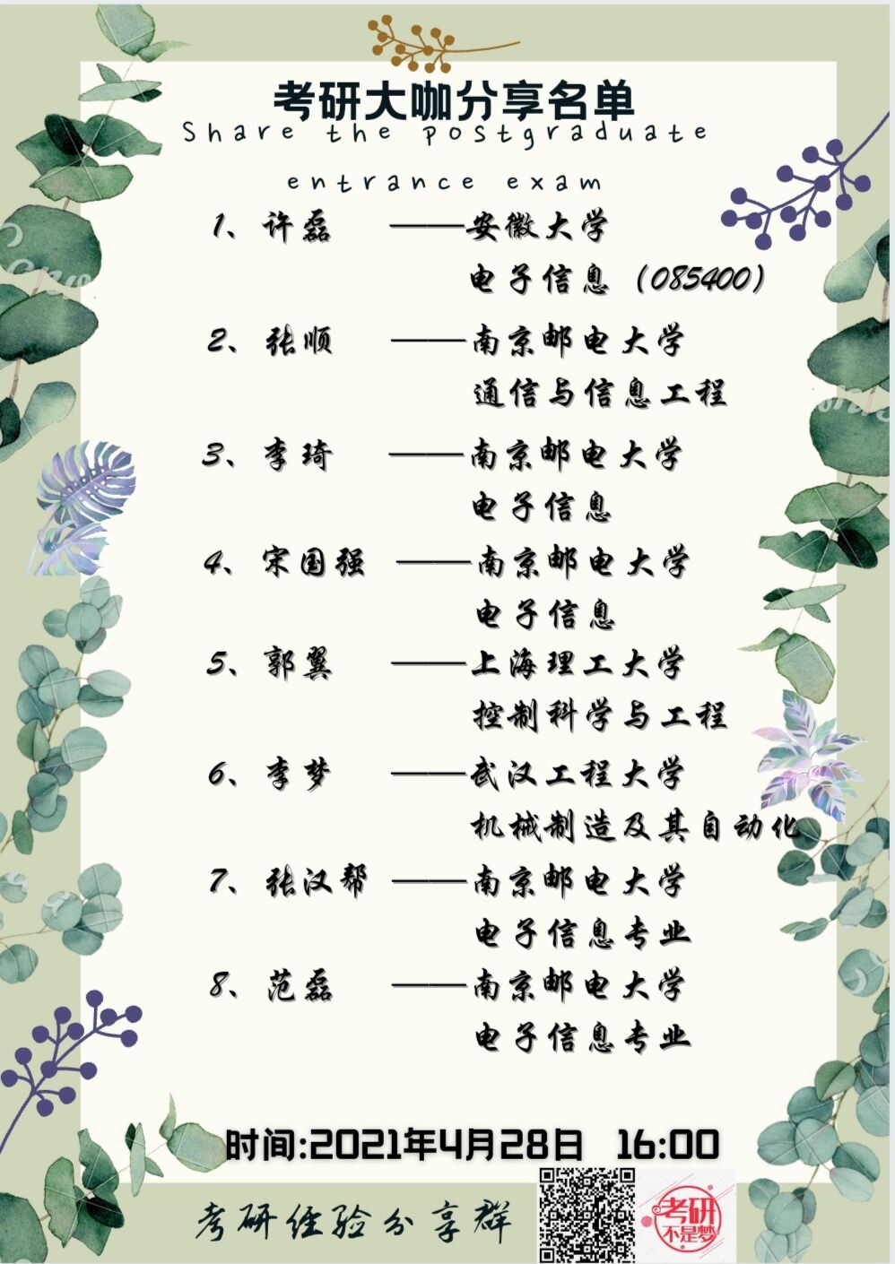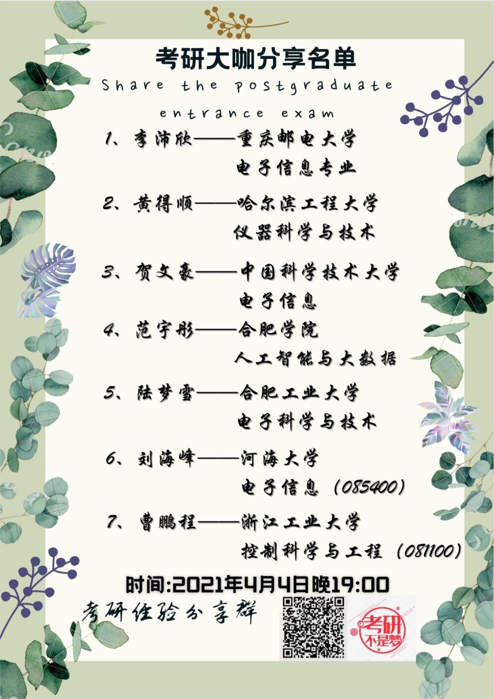 本次分享会邀请了已经在科大读研的15级贺文豪同学和今年考取南京邮电大学、武汉工程大学、上海理工大学、上海机电大学等高校研究生的17级各专业学生代表。学长学姐们分别介绍了自己的考研心得,并结合自己的复习经历讲述了在备考期间应注意的问题,包括考研各科的复习方法、考研信心的树立、考研计划、备考心态的调整、生活饮食习惯、作息时间安排,以及有关选择专业方向和复试等方面的一些经验体会。