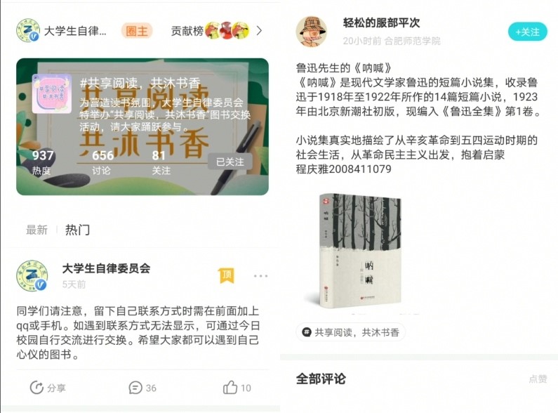 活动以“共享阅读”为主题,运用今日校园APP平台,以话题讨论形式展开。同学们积极参与,纷纷在话题评论区留下自己可借阅的书籍及个人联系方式,并利用今日校园APP平台留言互动。线下活动处,在各校区设置活动展台,工作人员为前来询问的同学热心讲解,加深参与人员对活动的了解程度,并进行PU签到。