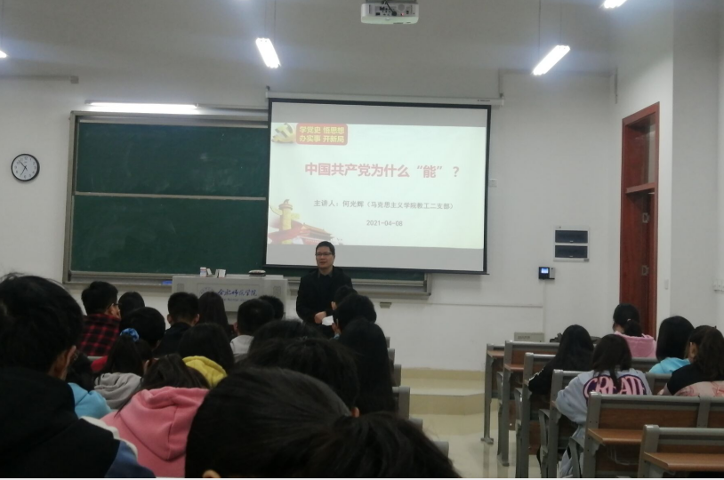 本网讯 为迎接中国共产党建党100周年,更好促进思想政治教育专业学子领会中国共产党铸就的优秀传统与精神,马克思主义学院于4月8日晚在滨湖校区博学楼B103教室举办“学党史·强信仰”专题讲座。讲座由马克思主义学院教工第二党支部书记何光辉主讲,思想政治教育专业2019级2020级全体同学参加了讲座。