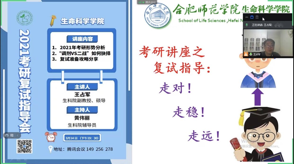 本网讯 为有效提高生命科学学院2021届本科毕业生研究生复试和调剂的成功率,精准把握复试备考过程中的方法和技巧,生命科学学院副教授、硕士生导师王占军主动作为,于3月14日晚19:30,利用腾讯会议App为生科院考研达线学生提供指导与帮助,充分发挥了党员教师的先锋模范作用。2017级辅导员黄伟丽组织考研学生参加指导交流会。